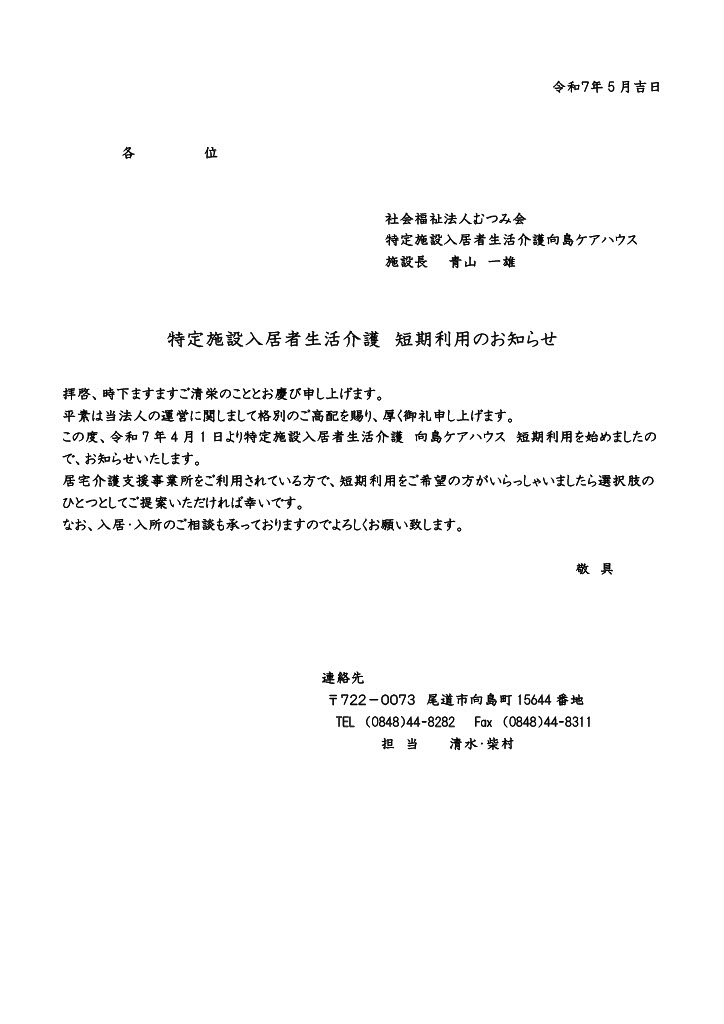 特定施設入居者生活介護 短期利用開始(令和7年4月1日)のお知らせ お知らせ情報 2025.05.142026.02.13 お知らせ情報 この度、令和7年4月1日より下記内容にて開始いたしました。 ご不明な点などございましたら上記連絡先、またはお問合せフォームよりお気軽にお問合せください。